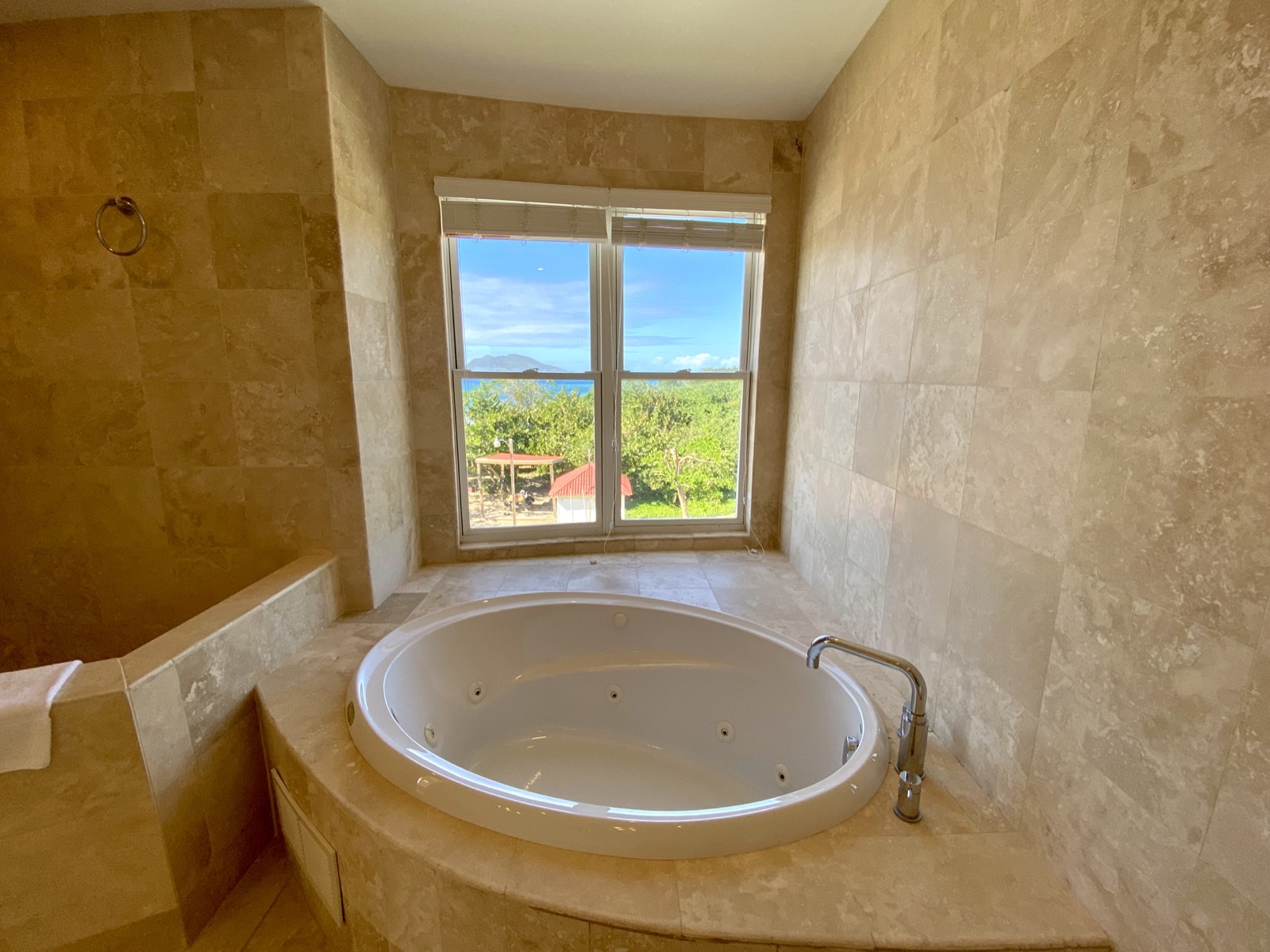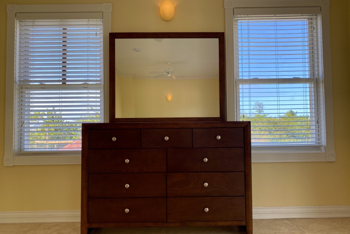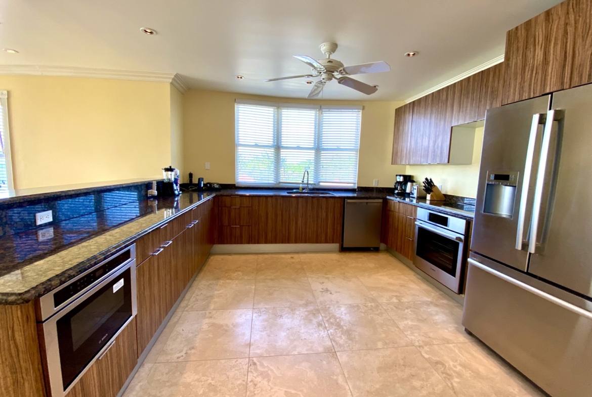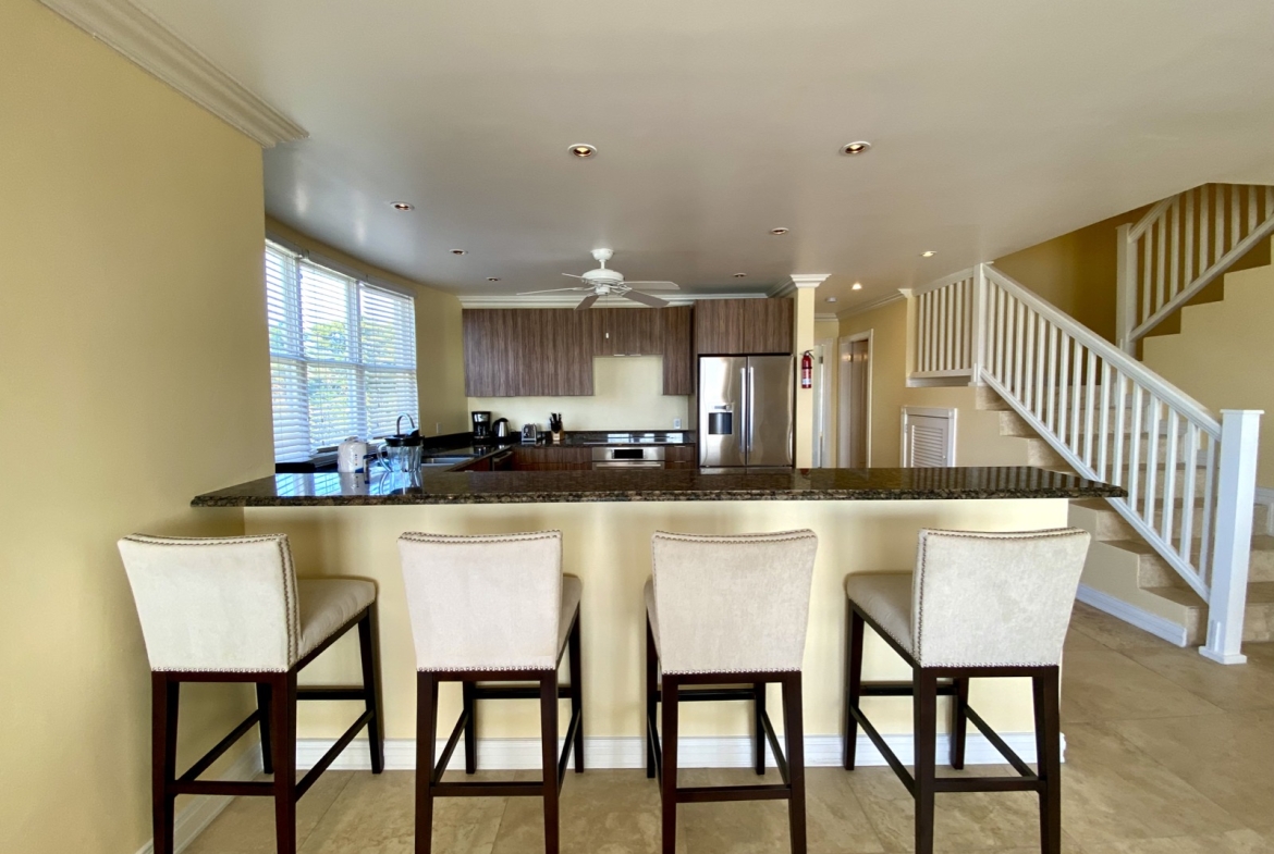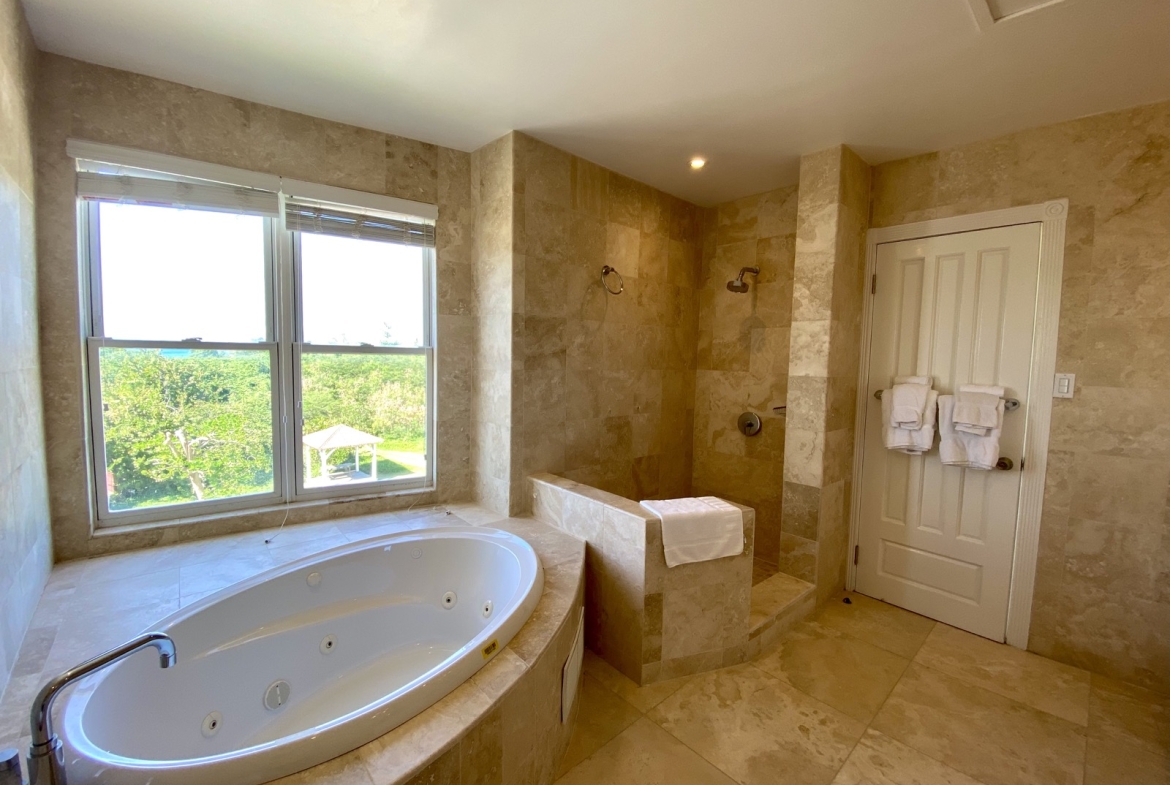 Everything is in place to create a glamorous, stylish home. The two top floor master bedrooms come with en suite bathrooms featuring twin vanities and luxurious corner spa tubs, and the third bedroom on the middle floor is a huge space where it would be easy to include an informal seating area for privacy and peace. All bedrooms come with private balconies, ideal for a quiet morning coffee or idle afternoon with a book and sunshine. Additionally, there are two separate dining areas with arched glassless windows perfectly framing classic Caribbean views of beach, sea and sky.